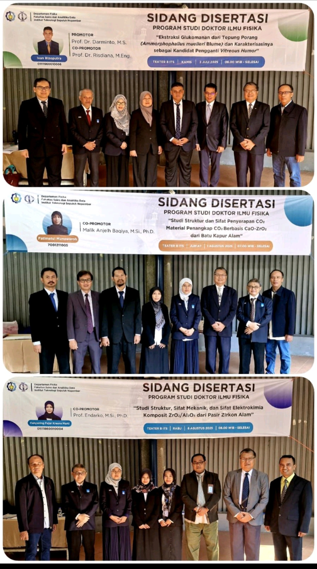 Congratulations and best wishes to the 2025 doctoral students of the Department of Physics, FSAD – ITS: 1. Ivan Rizoputra, 2. Fatimatul Munawaroh, and 3. Cahyaning Fajar Kresna Murti. Congratulations on their hard work during their studies in the Department of Physics, with their dissertation exams taking place between June and August 2025.