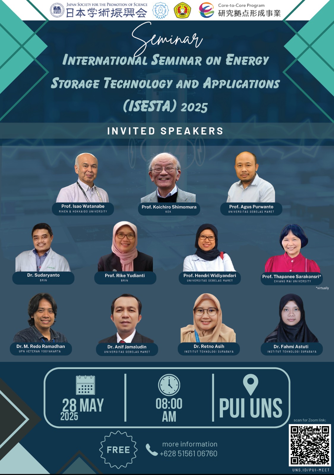 Retno Asih, Ph.D. and Fahmi Astuti, Ph.D. have delivered their talks as invited speakers in the International Seminar on Energy Storage Technology and Applications (ISESTA) 2025, held in Universitas Negeri Sebelas Maret (UNS), on May 28, 2025.