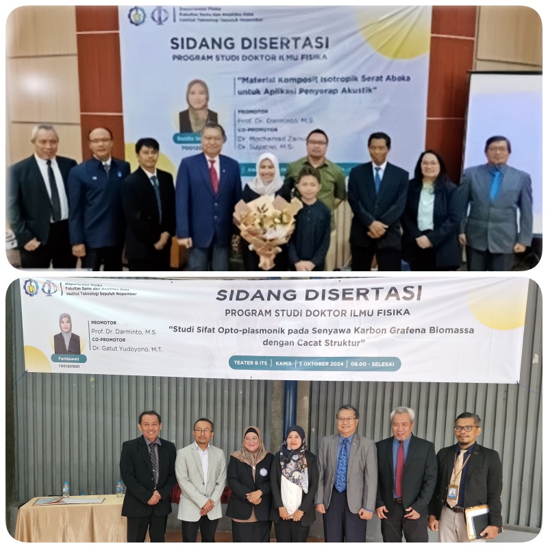 Congratulations and best wishes to the 2024 doctoral students of the Department of Physics, FSAD – ITS: 1. Susilo Indrawati, and 2. Faridawati Congratulations on their hard work during their studies in the Department of Physics, with their dissertation exams taking place in October 2024.